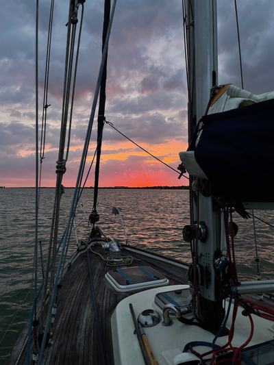 In the end the wind almost completely vanished, leaving us cruising silently up a glassy estuary towards the sunset as the evening came on. A very pleasant end to the day.