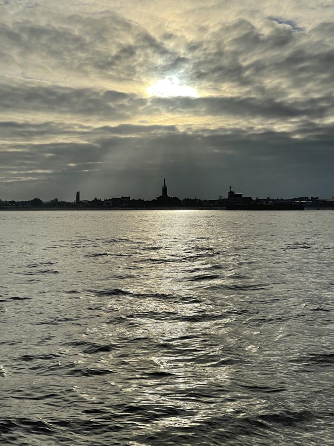 That evening, the sun goes down over Harwich church.