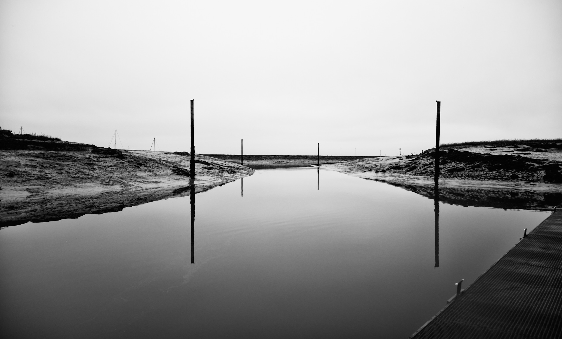 The Road Home: This the channel out of Bradwell Marina, just after dawn. A very East-Anglian sight at low tide. About 20 minutes later we had enough depth to creep out.