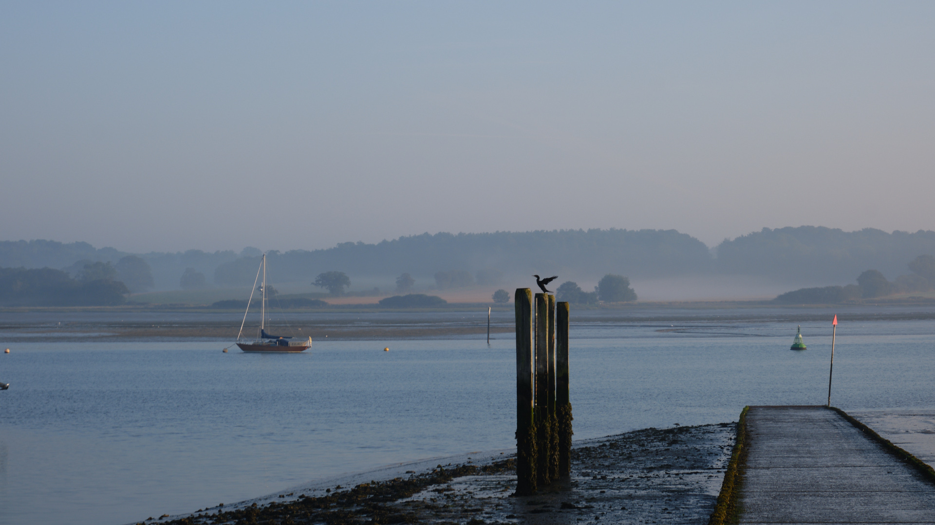 A cormorant dries his wings as the sun makes its appearance. But the fields are still shrouded in mist.