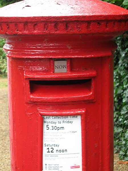 For those not familiar with the finer points of operation of the British postbox, the little metal label just above the slot is changed by the postman on each visit, to indicate the day of the next collection. This one got inverted by mistake, making it appear as if our local service might be rather prompter than usual!