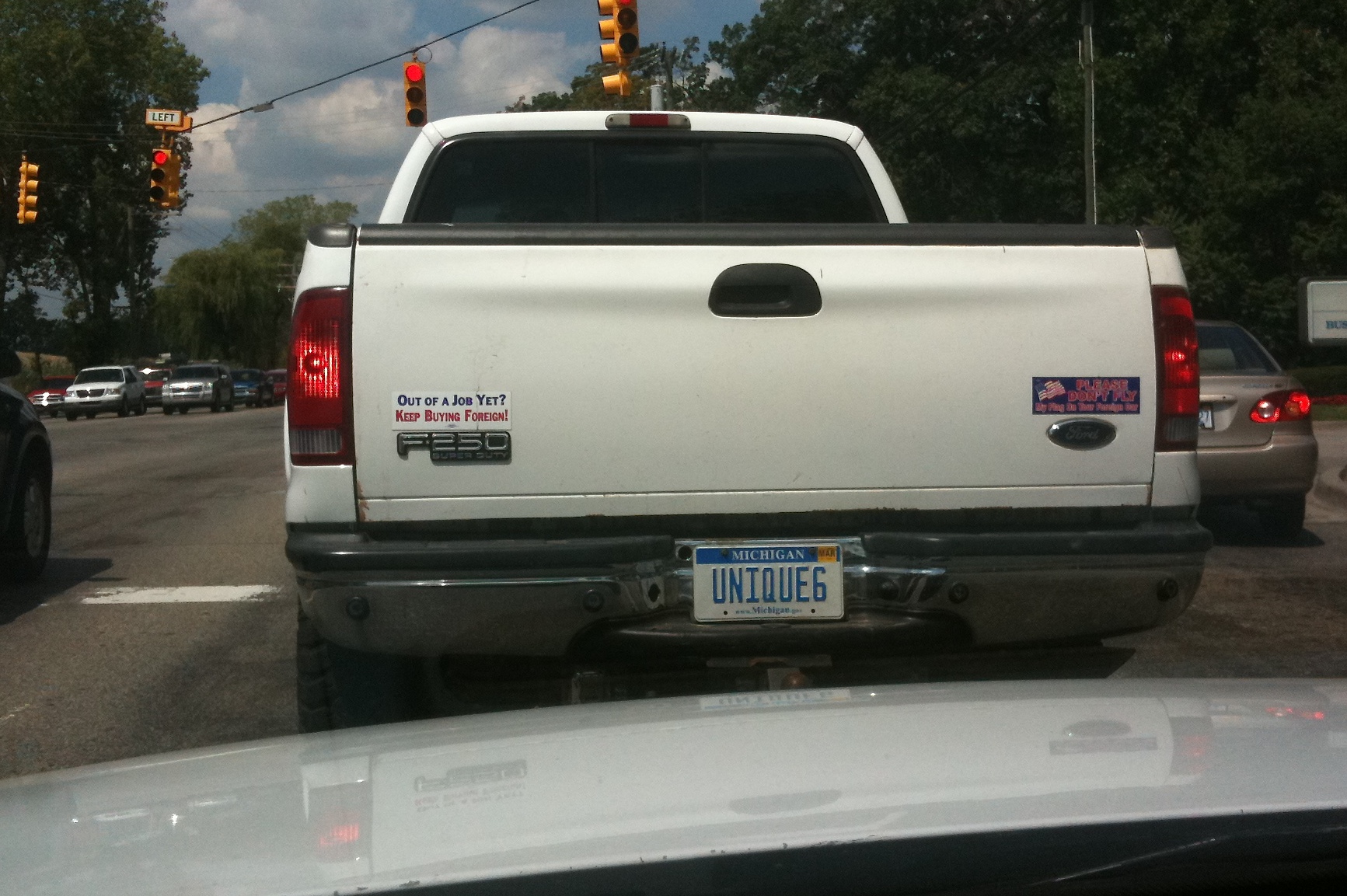 There are two stickers on the back. The left one says, “Out of a job yet? Keep buying foreign!” and the other, “Please don’t fly MY flag on your foreign car!”