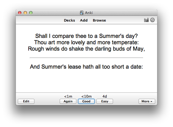 Richard wrote a little while back about using this model to learn a reading he had been asked to give at a wedding. I've always liked learning poetry or bits of Shakespeare, but often find that large chunks will flow easily while there are one or two lines I always forget. Could this be the solution?One of the popular flashcard systems out there is an Open Source one called Anki, created by Damien Elmes. It has Windows, Mac, Linux and Web clients, plus Android and iOS (though these don't yet work on the latest version). And there are various ways you can get decks of cards in and out. The user interfaces are rather quirky, I find, and even the web sites can be confusing to navigate, but the underlying system works fine.