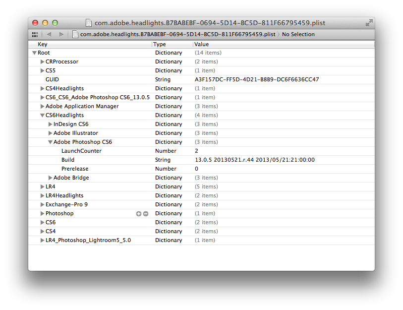 Anyway, open that file with a property list editor. I used XCode, but something like PrefSetter should work too. I burrowed into CS6Headlights > Adobe Photoshop CS6 where there was a 'LaunchCounter' variable. I'm guessing this is something to do with the number of times you can run the app before they ask you to participate.
