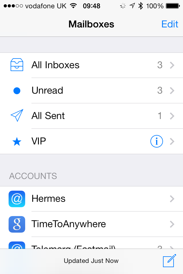 By default, each account's inbox is also visible in this list, but I don't really care too much about where messages came from - if I need to check a particular inbox I'm happy to dig down into its account, so I turn these off to keep things simple.