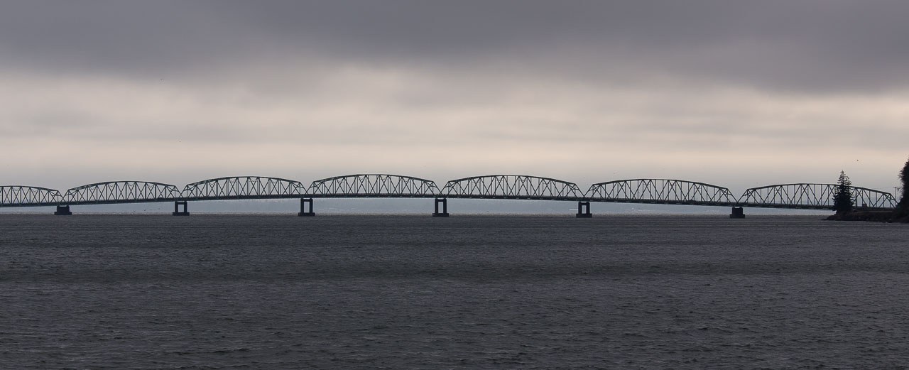 I'm at the mouth of the Columbia River, in Astoria, Oregon. It's quite a river. The bridge that crosses it here is about 4 miles long. Here's a little bit of it: