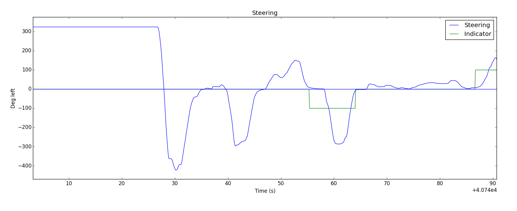 This first plot shows the angle of the steering wheel, as recorded by the car's own sensors.
