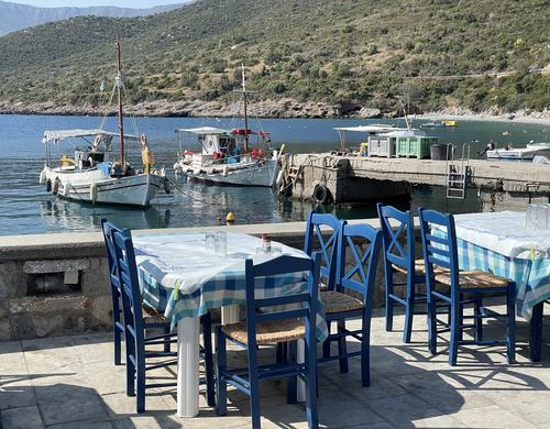 It's my first trip to Greece, and I'm loving it. The temperatures well into the 30s are hard to take, but there's quite a bit of compensation in the fact that if you step off the boat into the turquoise water, as I do a couple of times per day, it cools you pleasantly to its 29C.