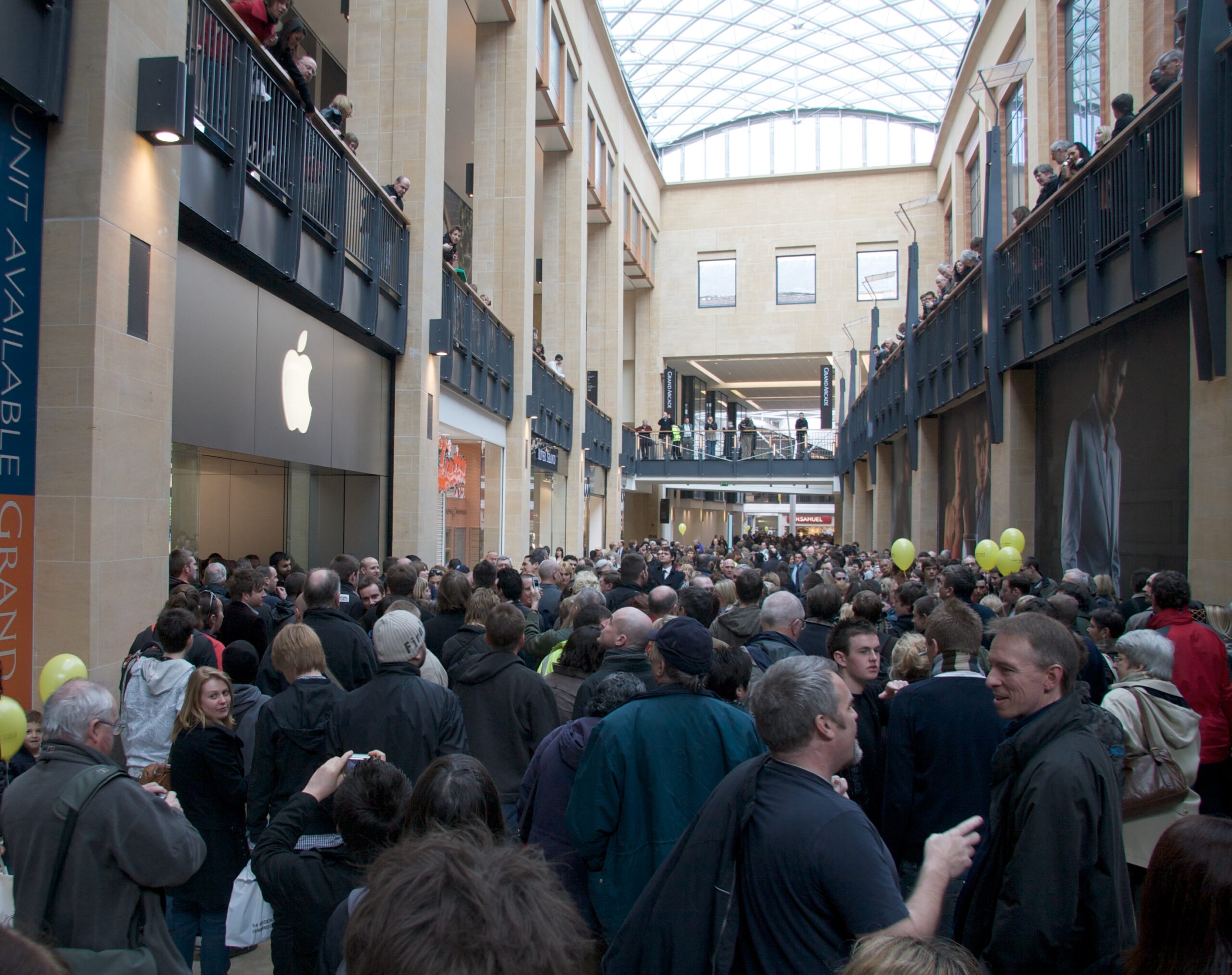 All mildly entertaining, but for me, the most amazing thing was the genius of the Apple marketing machine. I didn’t even go into the shiny new Apple store – I’ve been into plenty of those in other places – but hundreds of other people did. Dozens of new shops opened their doors for the first time today, but the centre was dominated by the long queue waiting to go into Apple and get their free tee-shirt. The Apple employees outside cheered and applauded the first customers to enter. People lined the galleries wondering what was happening and asking each other why this was the most exciting thing in the arcade. Sheer brilliance.