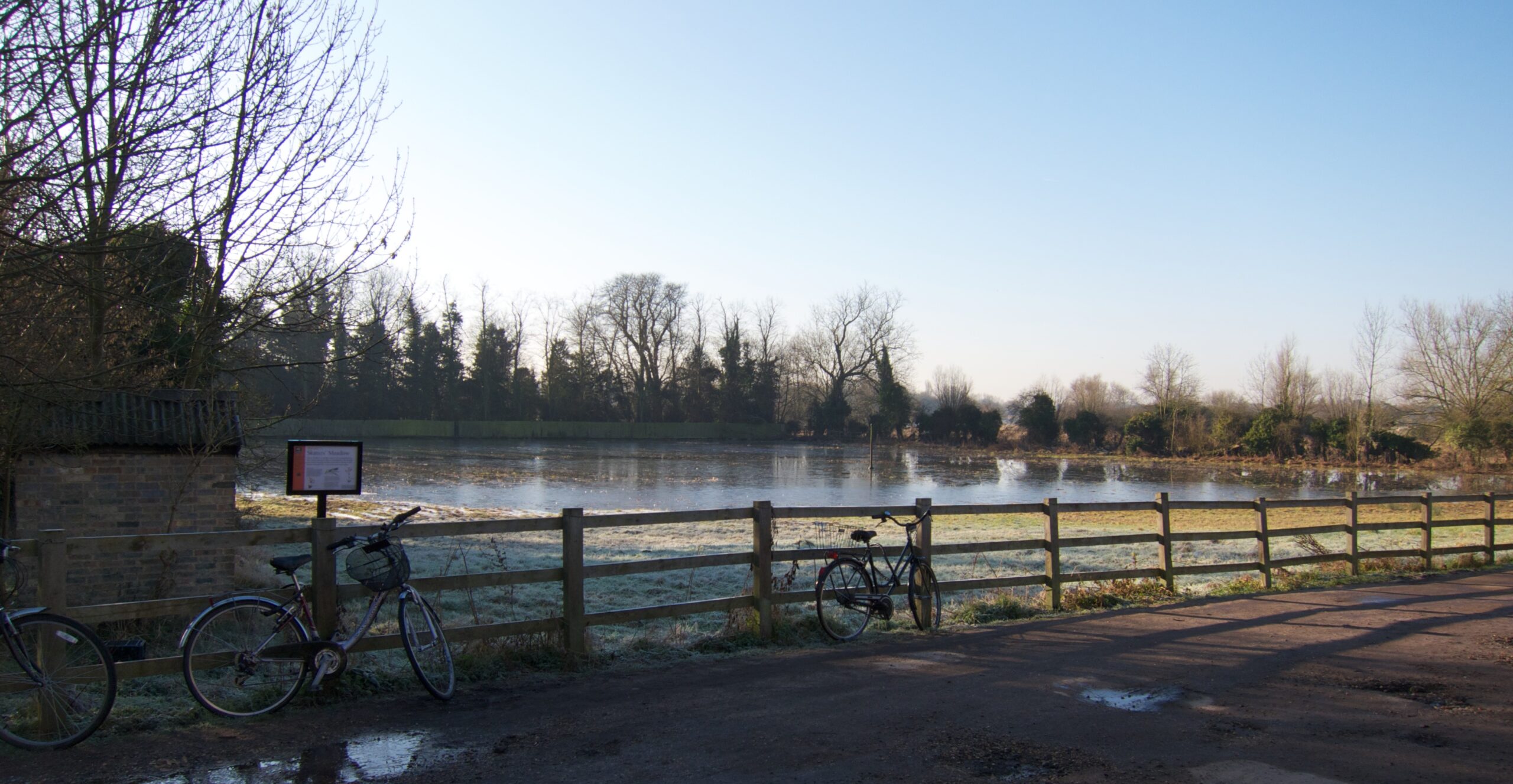 These days, it's managed as a nature reserve, and is no good for skating, partly because the winters aren't cold enough any more, but mostly because it very seldom floods. So I snapped this picture after some heavy rain last week; it's the nearest I've yet seen it come to being a skating rink again. There was a little ice around the edges...