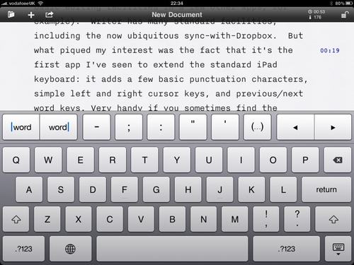 But what piqued my interest was the fact that it's the first app I've seen to extend the standard iPad keyboard: it adds a few basic punctuation characters, simple left and right cursor keys, and previous/next word keys. Very handy if you sometimes find the process of selecting a precise point with your big fat fingers a little tricky, as I do, though even that is easier here thanks to the large and well-spaced font the developers have chosen.