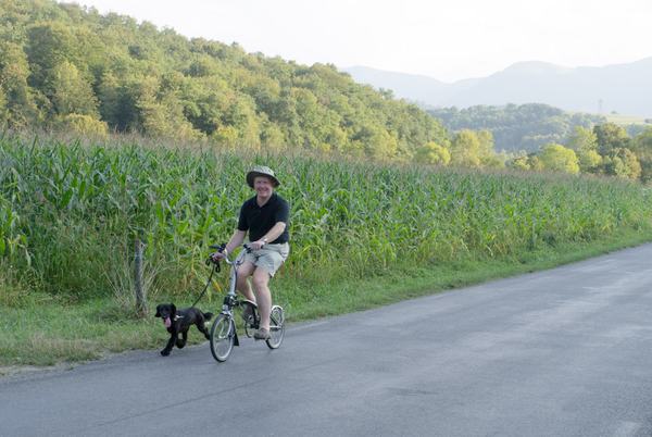 Complete with fashionable headgear, knobbly knees, trusty hound, and Brompton (on kind loan from John)