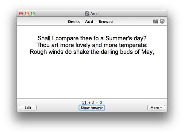 Richard wrote a little while back about using this model to learn a reading he had been asked to give at a wedding. I've always liked learning poetry or bits of Shakespeare, but often find that large chunks will flow easily while there are one or two lines I always forget. Could this be the solution?One of the popular flashcard systems out there is an Open Source one called Anki, created by Damien Elmes. It has Windows, Mac, Linux and Web clients, plus Android and iOS (though these don't yet work on the latest version). And there are various ways you can get decks of cards in and out. The user interfaces are rather quirky, I find, and even the web sites can be confusing to navigate, but the underlying system works fine.