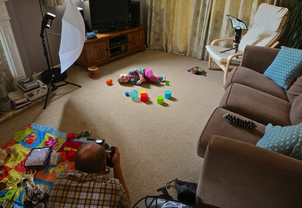 However, I needed to experiment more with some of my other equipment, so I had to find a subject who didn't mind spending some time in front of the camera. Fortunately, I was able to draw on the services of Richard's daughter Iris, who obligingly lay on the floor with some brightly-coloured toys and occasionally waved her legs in the air, while I pointed bright flashy things at her. Richard captured a nice image of our improvised studio.
