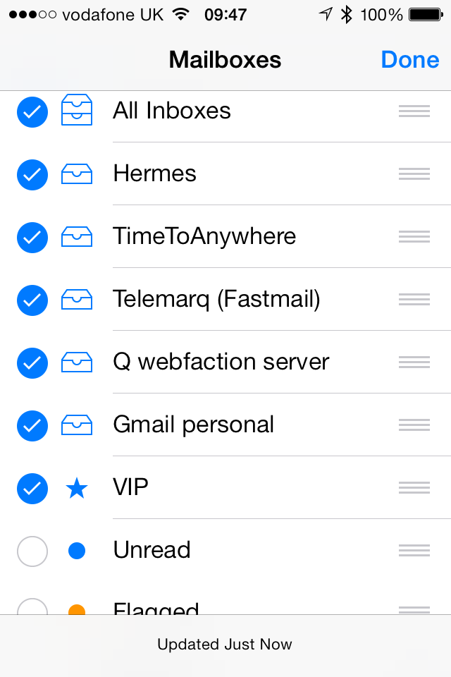 By default, each account's inbox is also visible in this list, but I don't really care too much about where messages came from - if I need to check a particular inbox I'm happy to dig down into its account, so I turn these off to keep things simple.