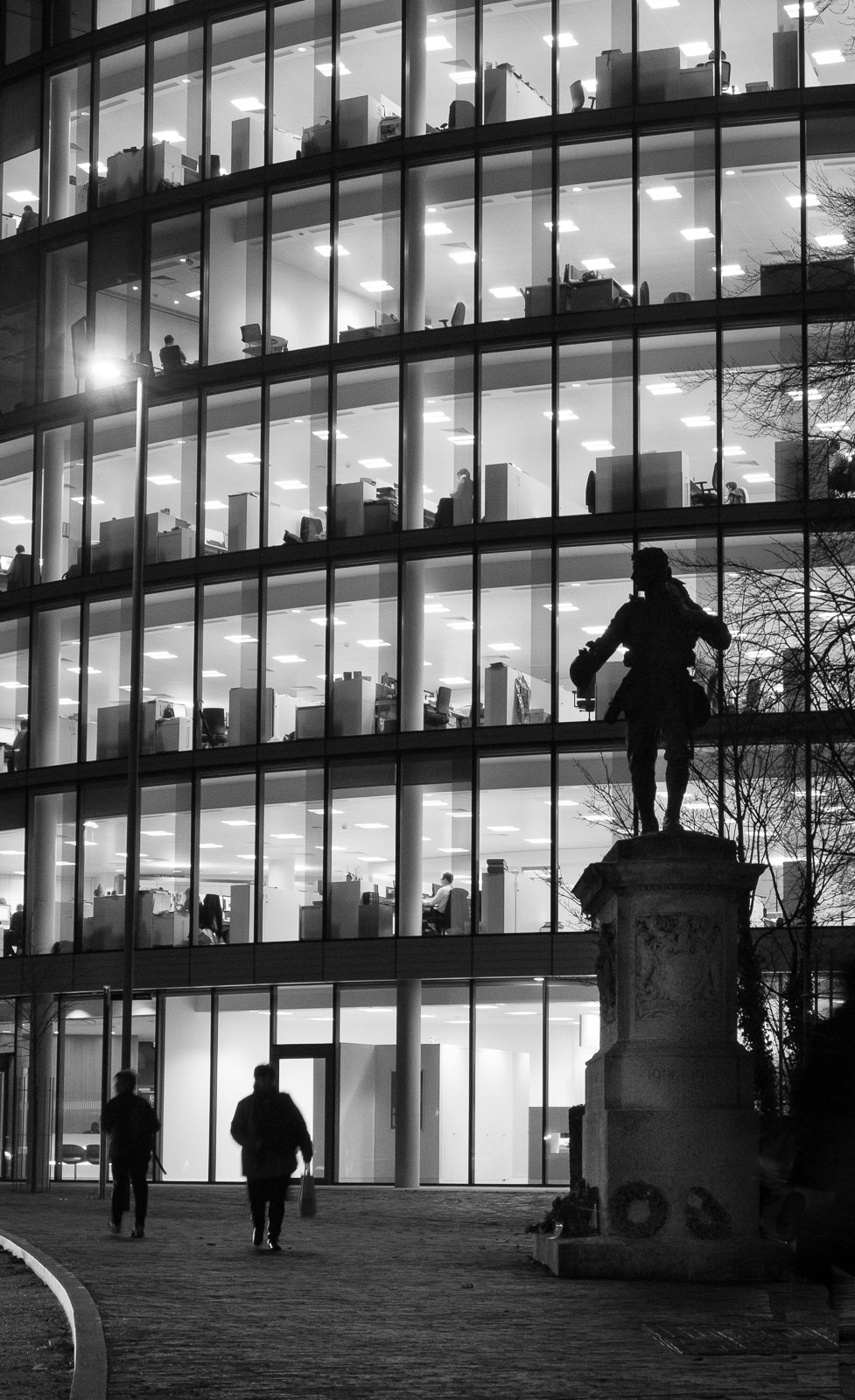 It struck me, as I cycled past tonight, how different his life must have been from that of the people in the cubicles behind him...