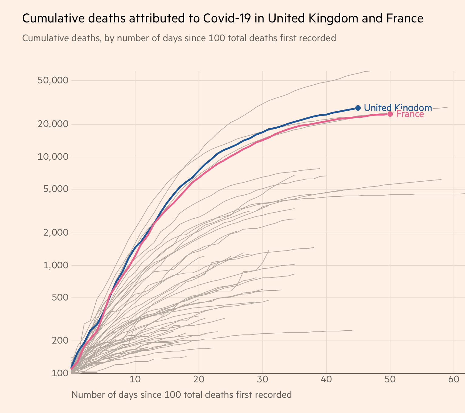 You don't have to switch countries to get different viewpoints, though. Suppose you wanted to make the case that the UK and France were pretty much neck-and-neck, you'd plot the absolute cumulative deaths on a log scale: