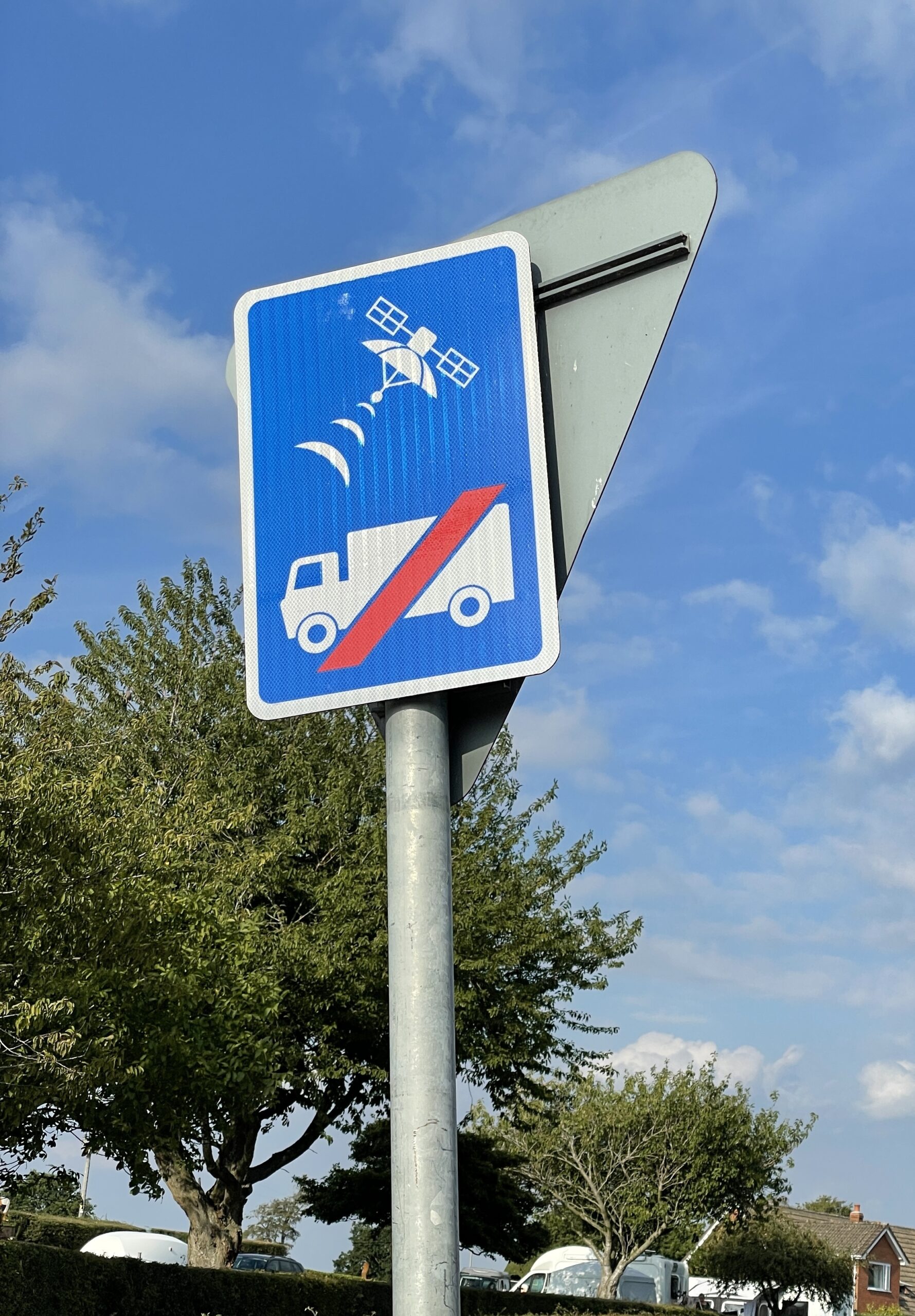 Spotted just outside Hay-on-Wye this evening, I think this sign is meant to say, "If you're driving an HGV, don't rely on your satnav." But in that case, the red line should really go through the satellite, n'est-ce pas?