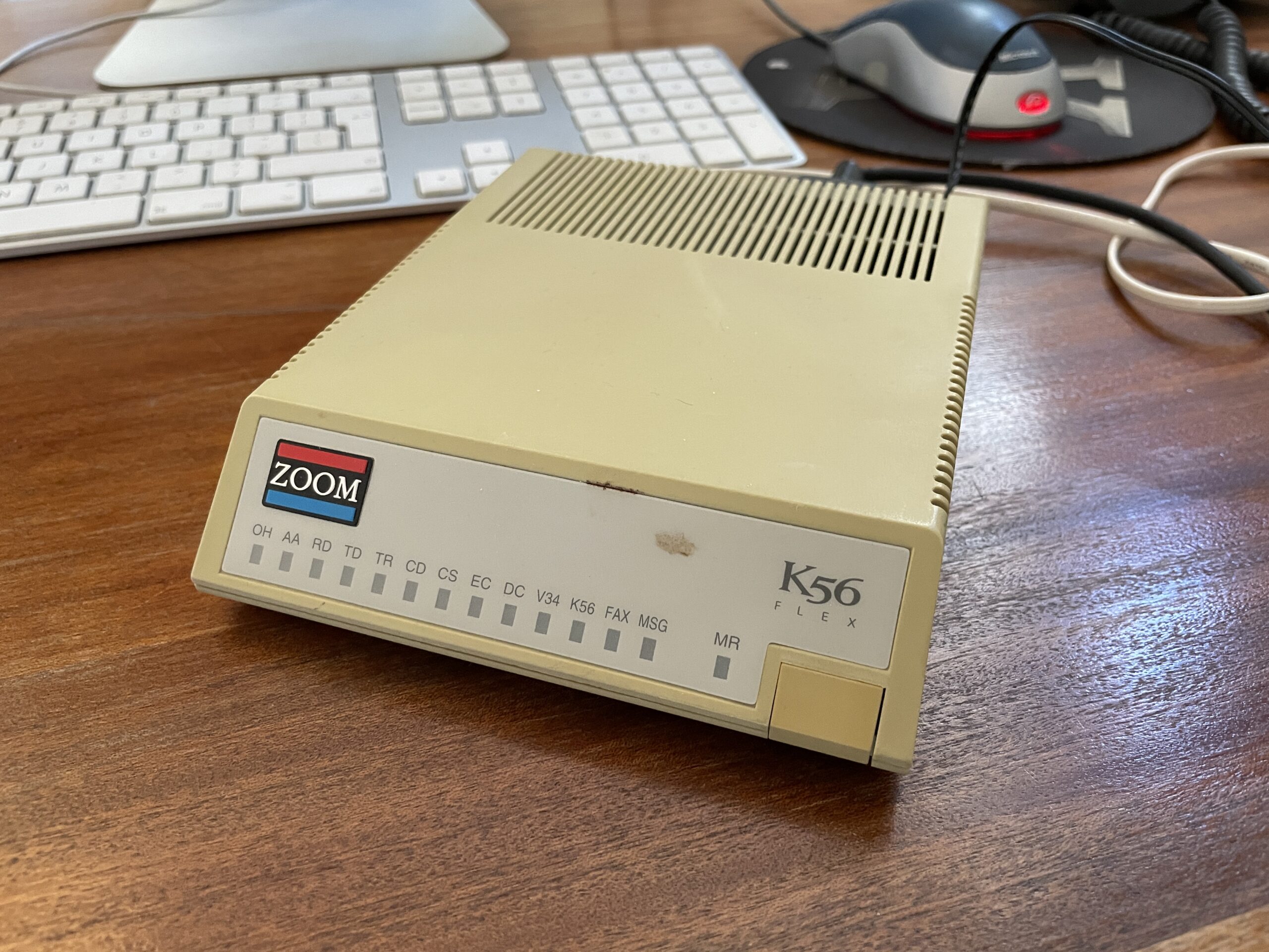 For younger readers, this is a 56K modem, which means that on a really good day, you could transfer data to and from the network at 56 kilobits per second: that's about 6 kilobytes/sec, once overheads are taken into account. This was pretty much the peak of telephone-based internet access, until ADSL came along.