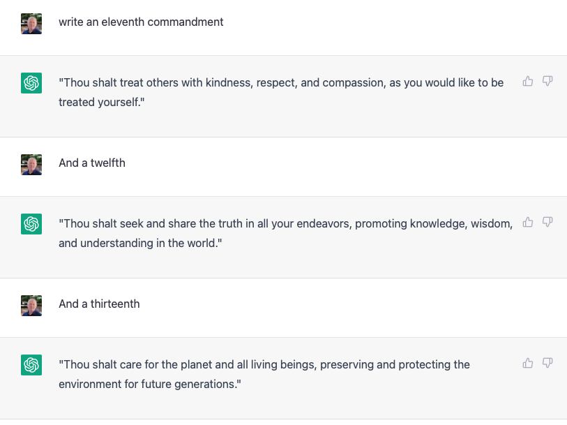February 6th, 2023 Deus ex machina ChatGPT is a fun way to procrastinate. Here's a recent experiment when I was meant to be doing something more important: I think these are rather better than some earlier proposals? Posted in General 0 Comments Possibly related posts: Sign of the times: might ChatGPT re-invigorate GPG? When DOES it make sense to use AI? A little younger and a bit more wise? The success of Django... and when the machines take over. The world's biggest reality-distortion field