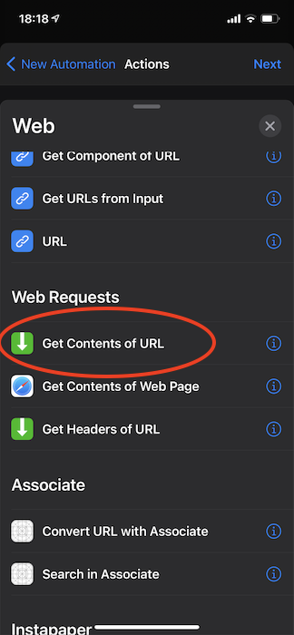OK, back to the iPhone. Now, your phone will need to make an HTTP POST request to that URL, but fortunately, this is easy to do. When adding an action to your automation, go into the 'Web' section and use 'Get contents of URL':