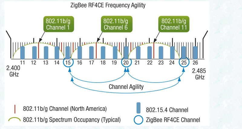 '802.11b/g', in case you don't know it, is part of the technical standard popularly known as Wifi, so the green labels show Wifi channels, and the blue bars show Zigbee.